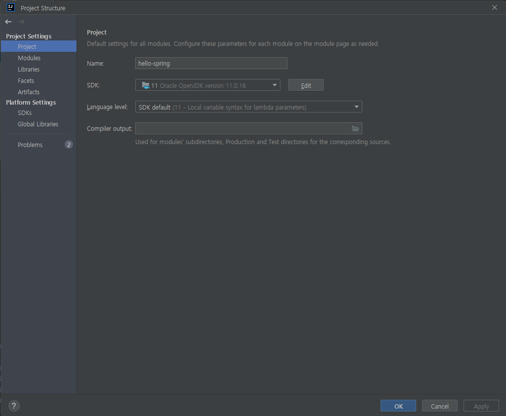 - Project Settings 에서 SDK 버전을 확인해 줍니다. 저는 18로 설정되어있어 11로 변경해주었습니다.