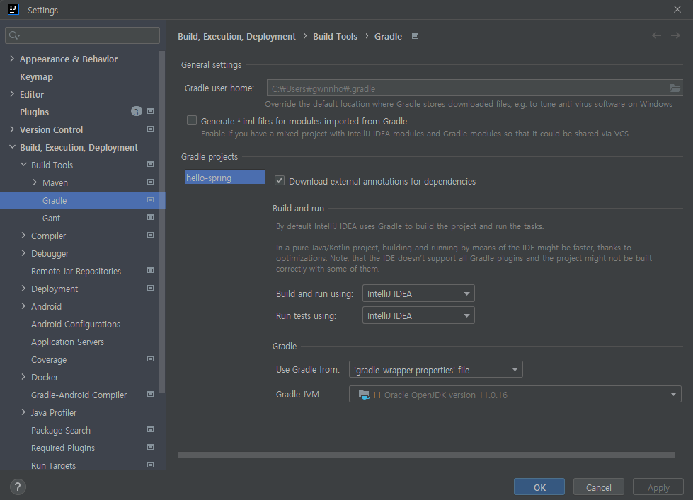 - Build and run을 위처럼 IntelliJ IDEA로 설정해 줍니다.