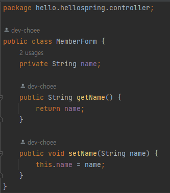 - 스프링이 폼에 setter로 매핑해서 전달 받는다.