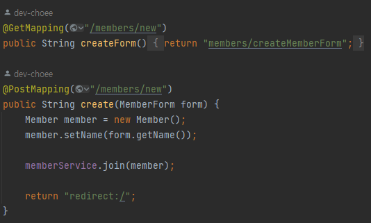 - get 메서드로 호출시 회원 등록 화면 불러오기, post 메서드로 호출시 회원 등록 컨트롤러 응답