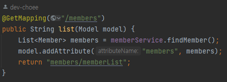 - 컨트롤러에서 모델에 List를 담아서 화면에 넘겨줍니다.
