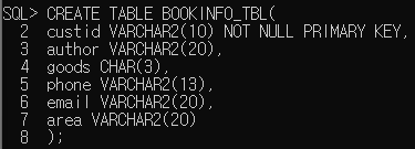 INSERT INTO BOOKINFO_TBL VALUES ('bbb','이고객','의류','010-1111-1112','bbb@korea.com','서울');
