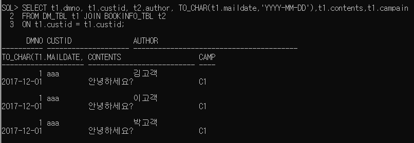 SELECT t1.dmno, t1.custid, t2.author, TO_CHAR(t1.maildate,'YYYY-MM-DD'),t1.contents,t1.campain