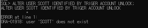 - 명령어: ALTER USER SCOTT IDENTIFIED BY TIGER ACCOUNT UNLOCK;