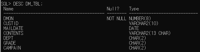 1 dmno DM발송번호 number 8 NOT NULL Primary Key