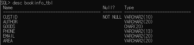 INSERT INTO BOOKINFO_TBL VALUES ('bbb','이고객','의류','010-1111-1112','bbb@korea.com','서울');