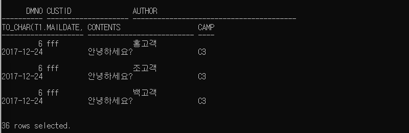 INSERT INTO DM_TBL VALUES (3,'ccc',TO_DATE('20171201','YYYYMMDD'),'안녕하세요?','10','3','C1');
